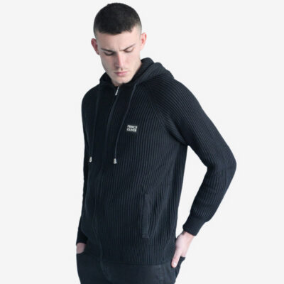 Full Zip Black Hooded Structured Knit Cardigan (Modern Fit)