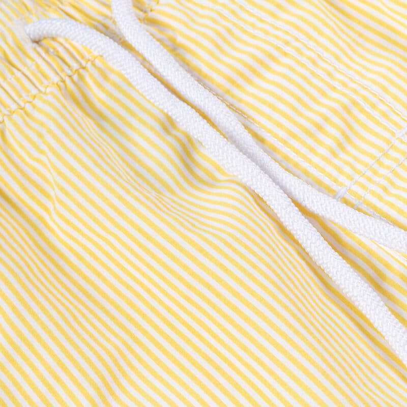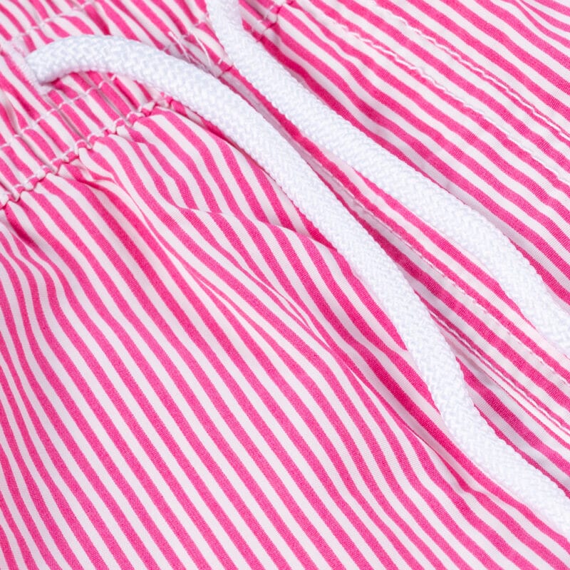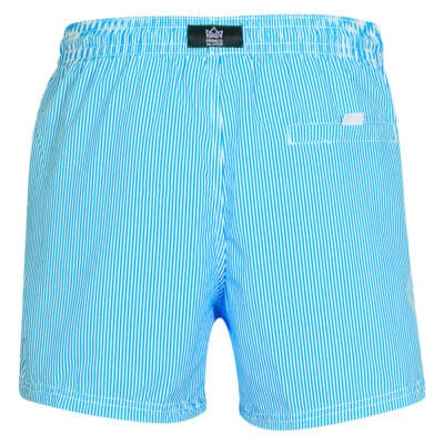 To stand out in your beach appearances and be attractive, choose a swimsuit with a stripe. At the right length, it dries very quickly and fits perfectly with colored polo shirt, jockey hat and espadrilles or white sneakers.
