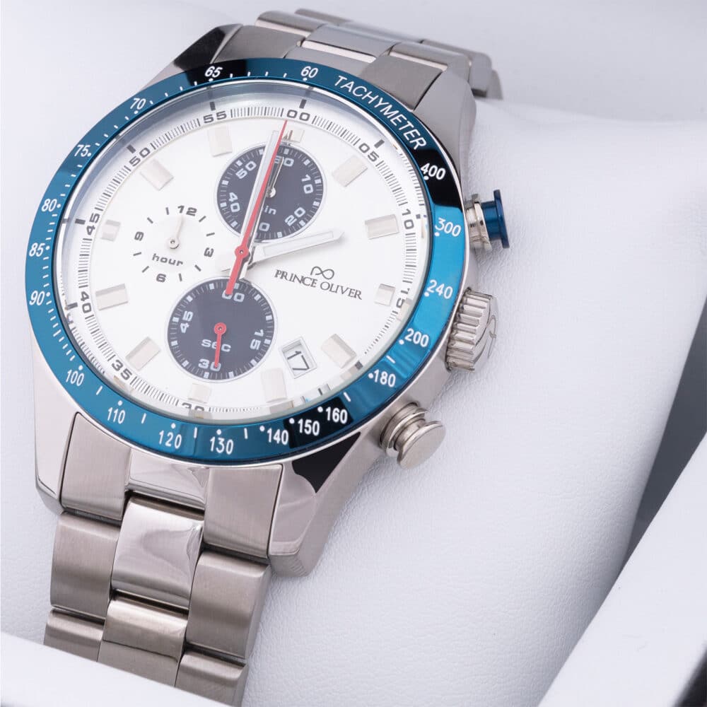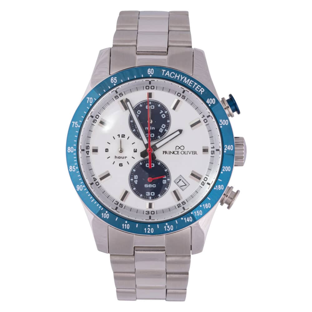 Prince Oliver enters the world of watchmaking with models that combine sharp design with Swiss and Japanese reliability in the movements. Stainless steel chronograph, with large 45 mm case, white dial and three sub-dials (hours, minutes, seconds), speedometer on the bezel and date indication, water resistant to a depth of 50 meters.