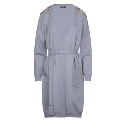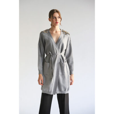 Show off your style with this stylish gray cardigan that combines comfort and sophistication. The built-in belt accentuates the waist, offering a chic silhouette, while decorative beading on the shoulders adds a touch of glamor and femininity. Ideal for casual appearances, but also for more formal occasions. Combine it with trousers, a skirt or even a dress for a complete and elegant look.