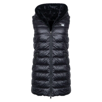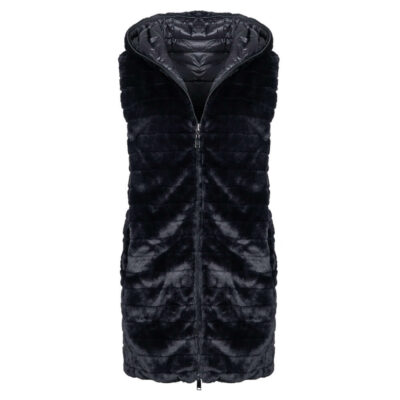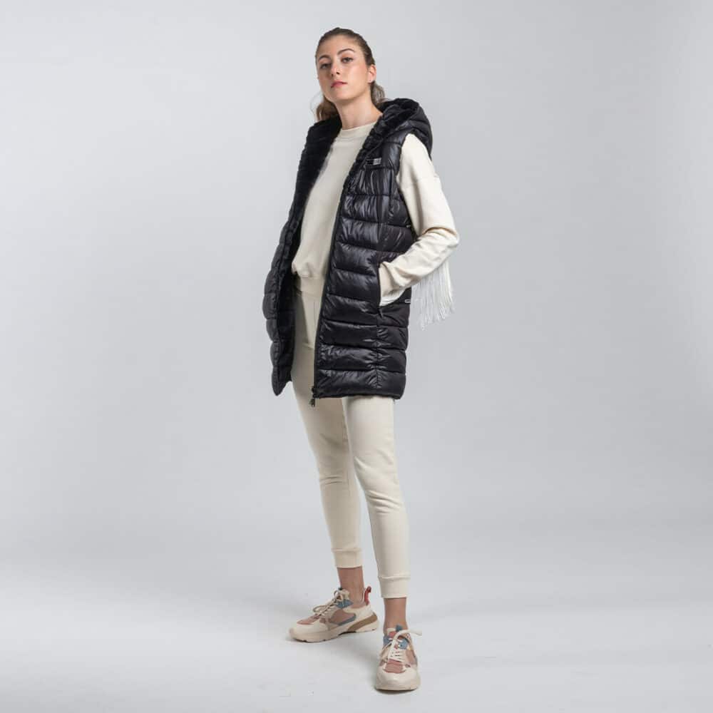 Long sleeveless jacket with arctic elements double-faced with a hood, to enjoy the winter season, without any compromise on style. Comfortable and warm, it will become your best companion for the cold days and nights either in the city or in the countryside and will be adapted to any clothing choice.