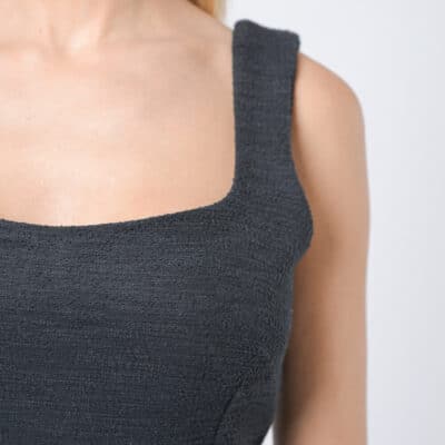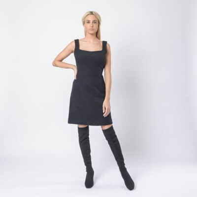 Midi bouclé dress with wide strap in A line line. A dress with a unique characteristic of elegance in simplicity. Combine it with black over the knee boots for a special look!