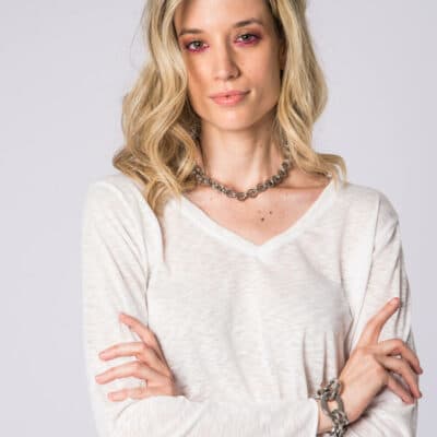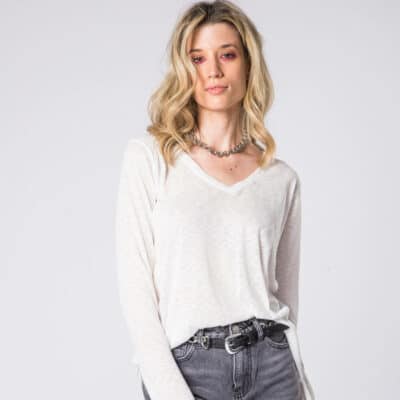 We recommend a long sleeve t-shirt made of light flame, 100% cotton. Ideal piece for a casual outfit. Combine it with jeans and leather and you will have the ultimate modern minimal style!