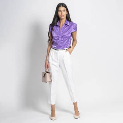 A metallized brocade shirt is a must-have this season, pair it with formal trousers, a chic sandal and top it off with a handbag.