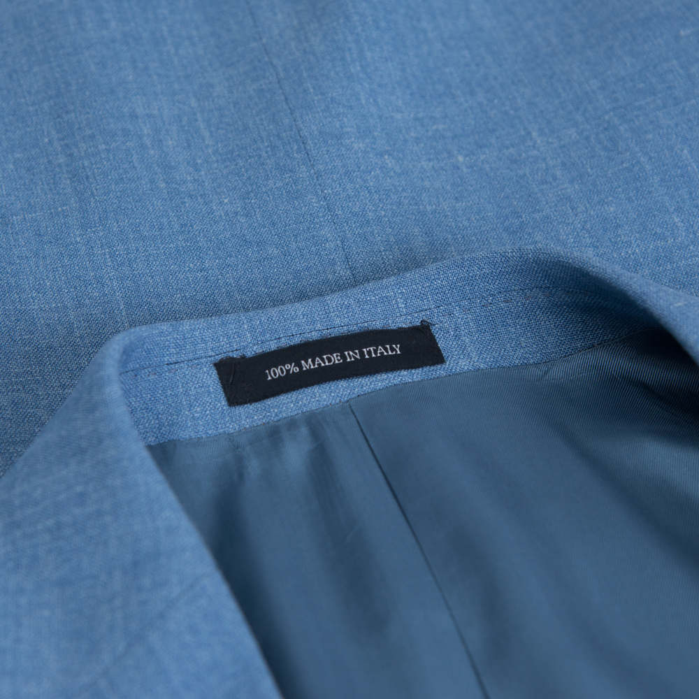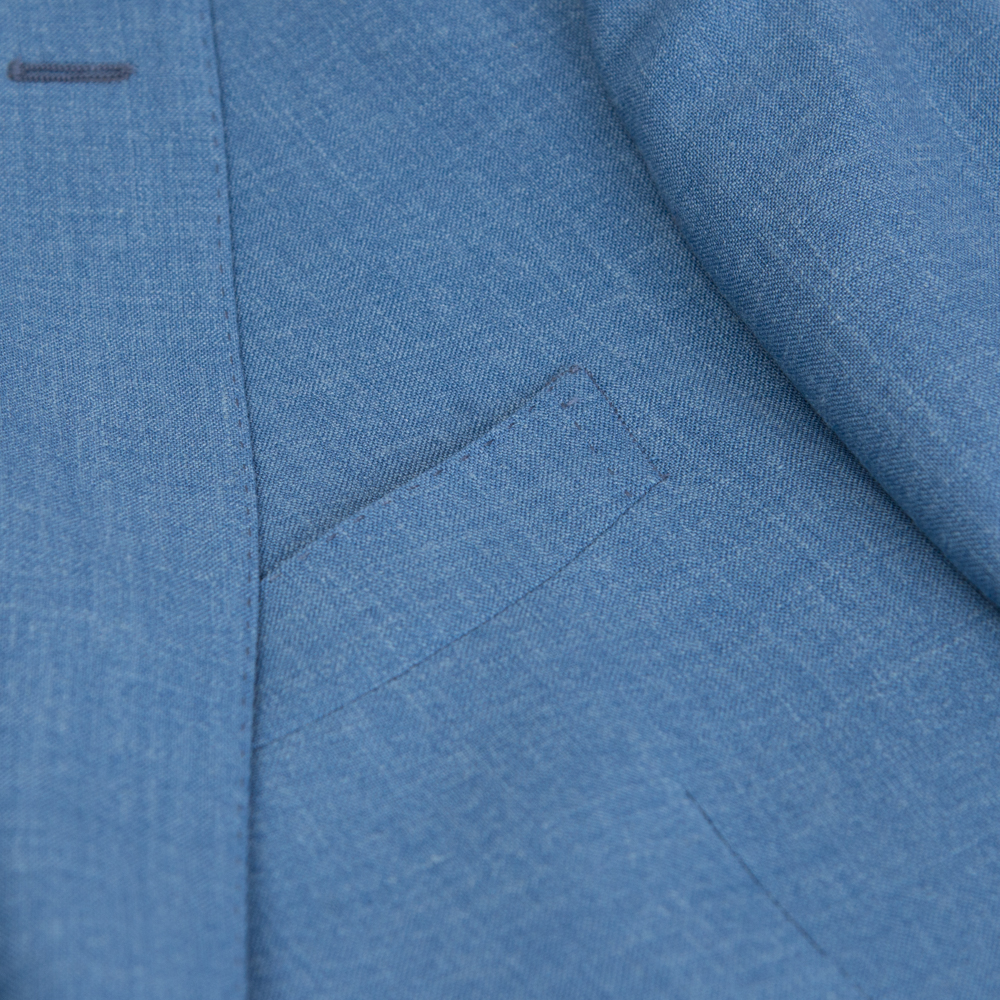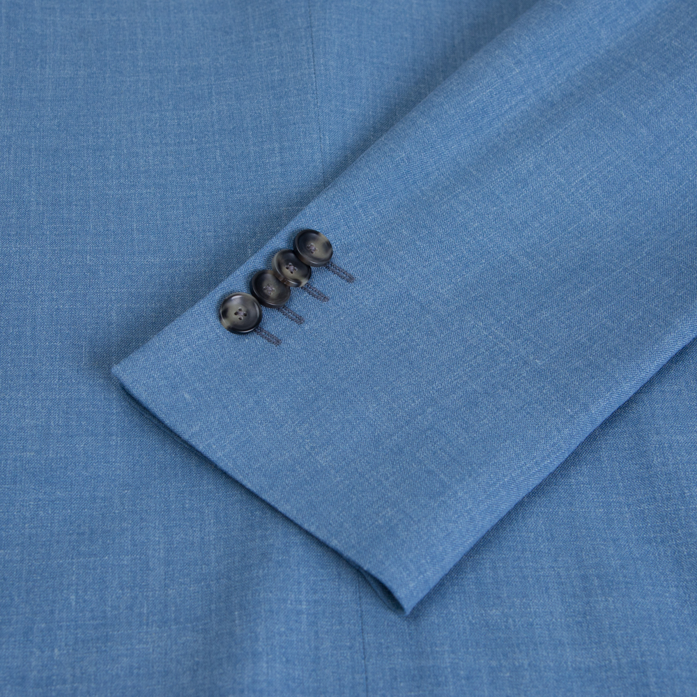 Αυτό το δίκουμπο κοστούμι σε φωτεινή σιέλ απόχρωση ενσαρκώνει τη “δροσερή” πολυτέλεια. Κατασκευασμένο από το διάσημο ύφασμα Summertime του οίκου Loro Piana, συνδυάζει τις καλύτερες φυσικές ίνες για να προσφέρει ένα ένδυμα που αναπνέει, παραμένει ελαφρύ και διατηρεί την άψογη φόρμα του ακόμα και στις πιο υψηλές θερμοκρασίες.