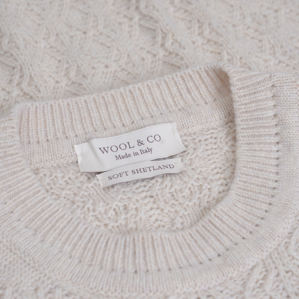 WOOL & CO Crew Neck Μπλούζα Εκρού με Cable-Knit Πλέξη in Soft Shetland Wool Modern Fit