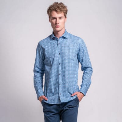 Ένα μακρυμάνικο πουκάμισο με μικροσχέδιο αποτυπώνει τη δημιουργική υπεροχή του οίκου Prince Oliver και συνθέτει ένα ολοκληρωμένο ιταλιάνικο look. Με εσωτερικό διάκοσμο στην πατιλέτα, στο κολάρο και στη μανσέτα για master roll γύρισμα, είναι το άλλο μισό του chinos παντελονιού, ενώ φλερτάρει φανερά με τα σακάκια και τα oxford παπούτσια.