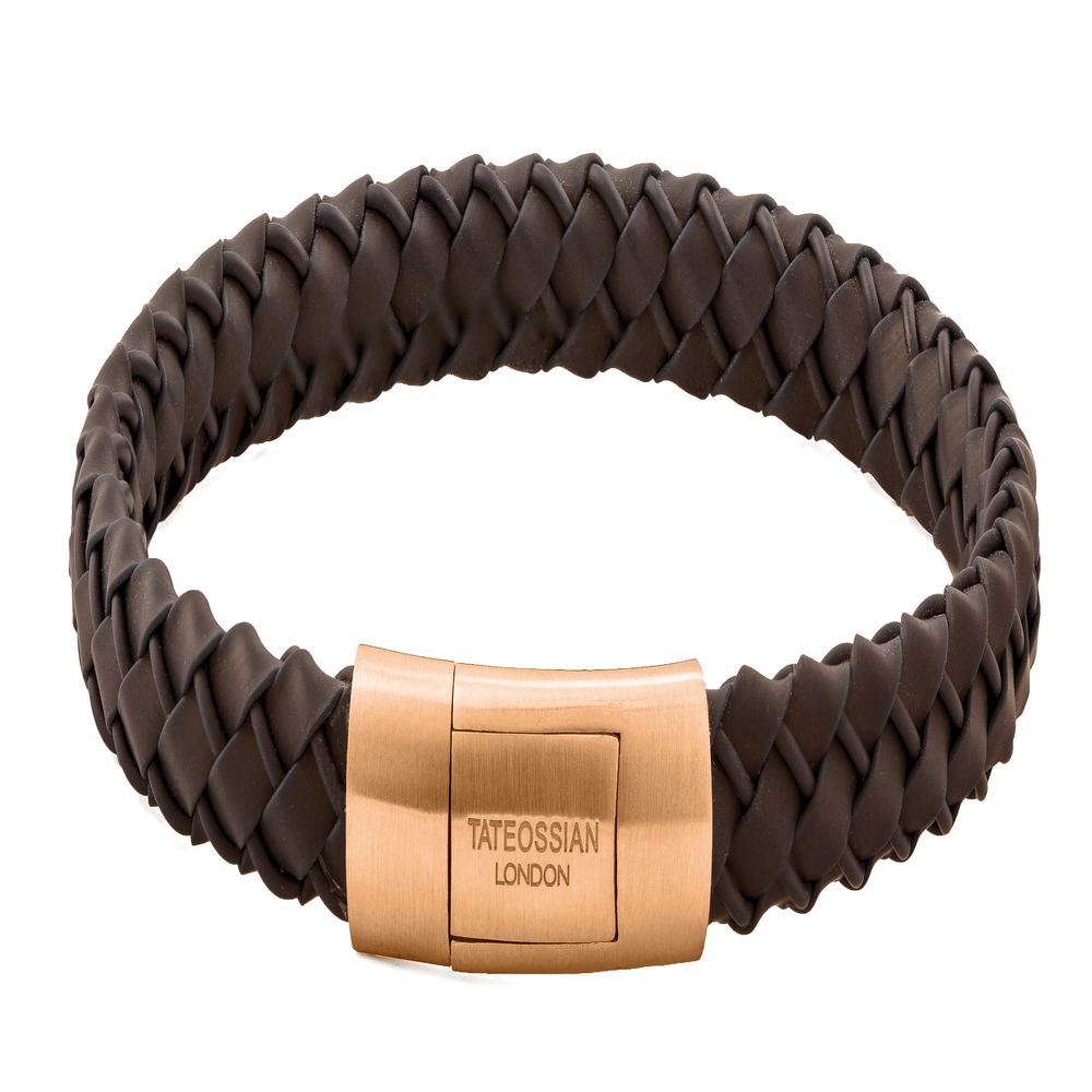 TATEOSSIAN Πλεχτό Δερμάτινο Βραχιόλι Καφέ με Rose Gold Κούμπωμα